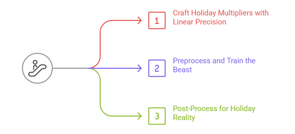 Generate baseline forecasts with the GBM, then reverse the magic: Multiply (or divide, depending on your setup) by the holiday multipliers. That 100-order prediction? Dial it back to 60 for Christmas Eve. Boom, forecasts that hug reality like a custom-tailored suit.